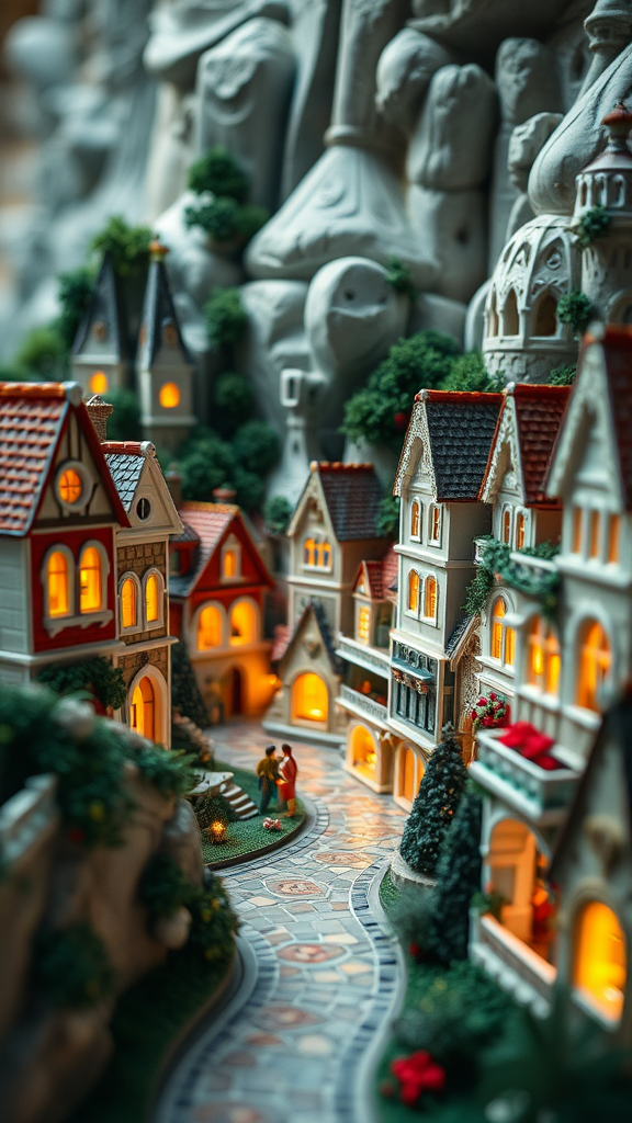 Tilt shift, 50mm capture of charming village crafted from marble, exquisitely detailed, intricate, colorful, seamless, cinematic lighting, inspired by a whimsical artist.