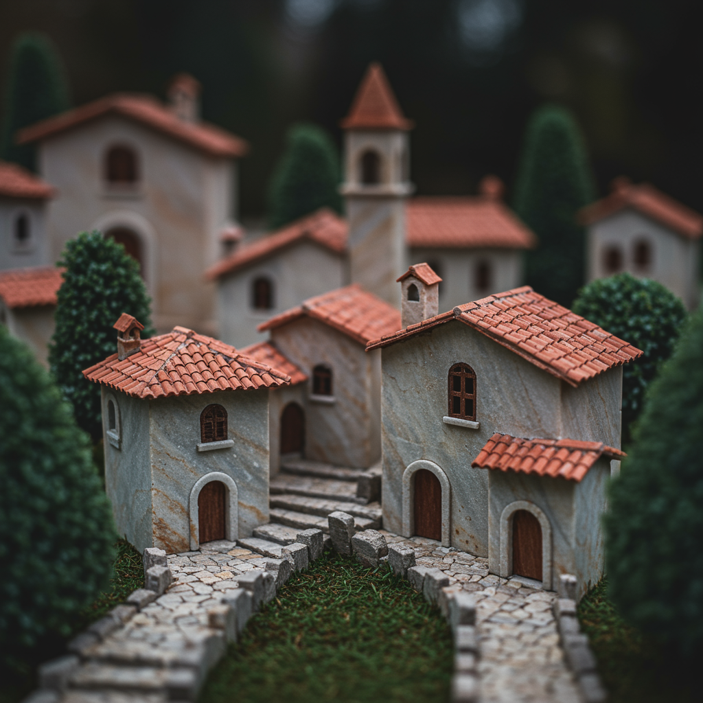 Tilt shift 50mm photo of a charming village crafted from marble, exquisitely detailed, with intricate textures and vibrant hues, featuring smooth, cinematic lighting, capturing the essence of a whimsical yet picturesque scene.