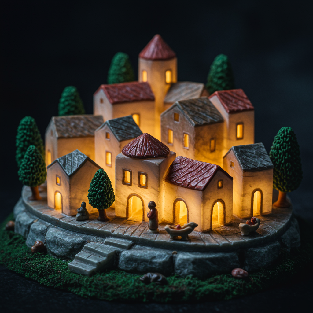 Tilt-shift 50mm photograph of an enchanting village carved from marble, beautifully detailed and intricately designed, showcasing vibrant colors and a smooth, polished surface, all enhanced by cinematic lighting that casts a magical glow, evoking the touch of a whimsical artist.