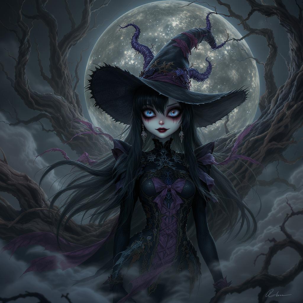 Tim Burton-inspired anime character, eerie and atmospheric, sharp features, large expressive eyes with a haunting gaze, UHD, HDR, 16K resolution, dark and moody color palette, elaborate gothic attire, intricate details, long shadowy limbs, slightly exaggerated proportions, haunting background with twisted trees and mist, surreal elements, whimsical yet unsettling, capturing a sense of mysterious intrigue and dark fantasy, all while maintaining a polished and clean aesthetic with no distortion or blurriness.