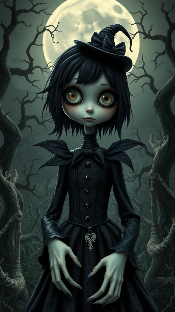 Tim Burton-inspired anime character, encapsulating a creepy and intriguing aesthetic. The figure has large, expressive eyes, a pale complexion, and dark, whimsical clothing with gothic undertones. The character is set against a hauntingly beautiful background, with twisted trees and withering foliage under a moonlit sky. The ultra-high definition image is richly detailed with high dynamic range, displaying subtle textures and contrasts. Hands and limbs are proportionate yet slightly exaggerated, maintaining an eerie yet captivating appearance. The scene conveys a sense of surreal otherworldliness, reflecting both elegance and dark fantasy.