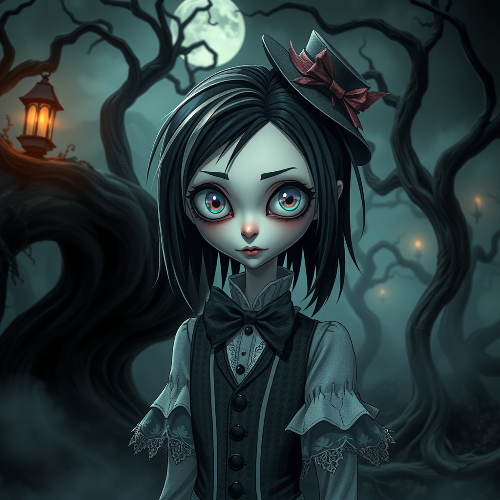 Tim Burton-inspired anime style with a creepy atmosphere, ultra-high definition and high dynamic range, 16K resolution. The scene features a gothic anime character with a mysterious vibe, set in an eerie, whimsical landscape. The character has exaggerated features typical of Tim Burton's style, such as large, expressive eyes and a slightly elongated face. Their attire is a mix of Victorian and fantastical elements, adding to the surreal ambiance. The background is a dark, twisted forest with gnarled trees and eerie fog, enhancing the unsettling yet captivating aesthetic. The overall composition has a sense of spooky elegance, drawing viewers into a world that is both haunting and enchanting. Special care is taken to avoid visual distortions or unattractive proportions, ensuring a harmonious blend of creativity and detail.