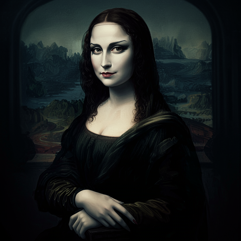 Tim Burton-inspired badass Mona Lisa, cinematic and highly detailed, staring intently at the camera with an enigmatic and powerful gaze, infused with elements of gothic and dark cinema. Realistic portrayal, evoking a sense of mystery and intrigue, set against a shadowy, atmospheric backdrop that highlights her confident and otherworldly presence. The image captures the essence of a timeless figure reimagined through a uniquely dark and captivating lens.