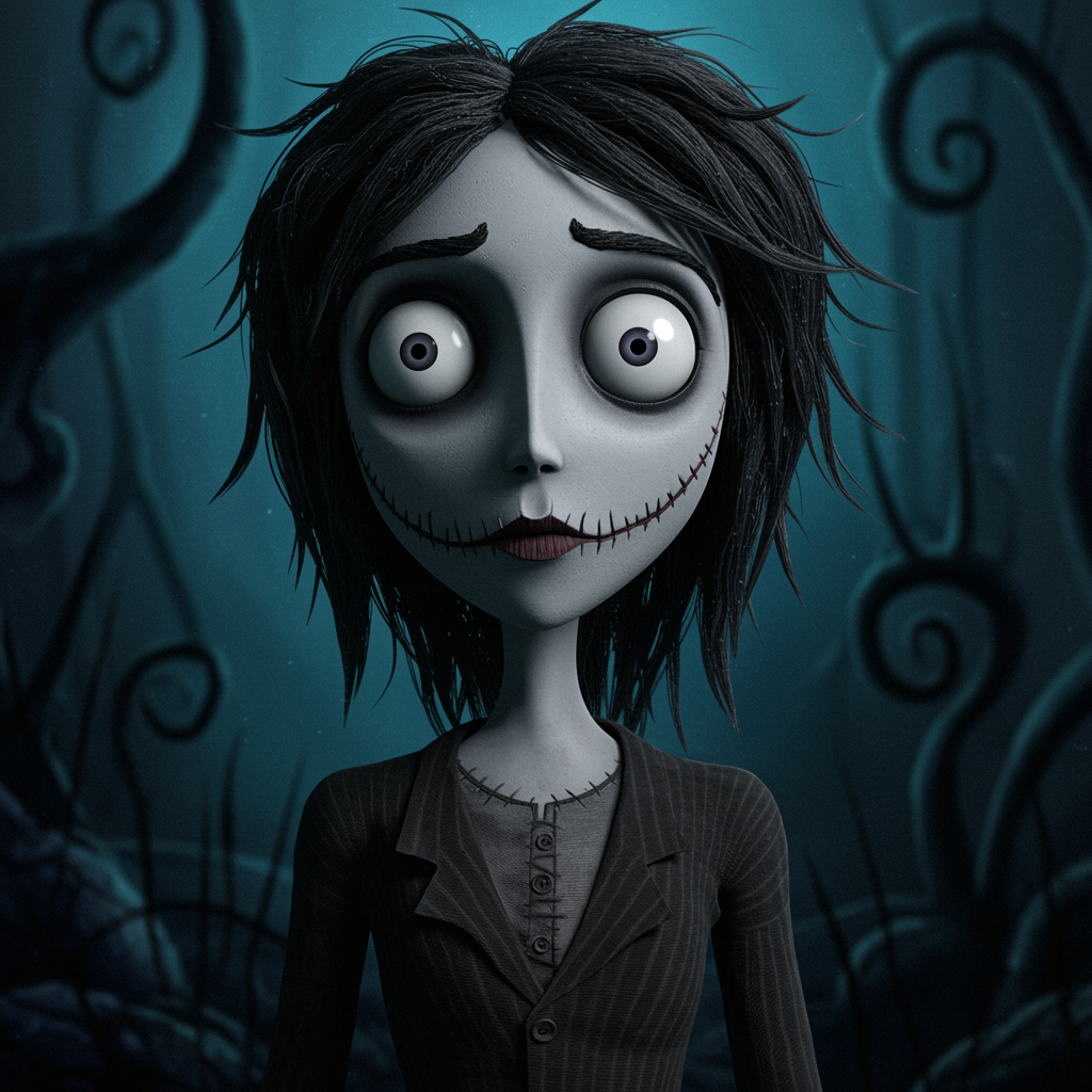 Tim Burton-inspired, eerie anime character, capturing a creepy yet whimsical vibe, vivid UHD detail, surreal gothic charm, hauntingly expressive eyes, intricate textures, ethereal atmosphere, delicate balance of shadow and light, otherworldly landscape, subtly distorted proportions, hint of the grotesque in a fascinating way, dreamlike setting with a touch of the macabre, darkly enchanting, vibrant HDR colors, ultra-high definition, richly detailed fantasy scene.
