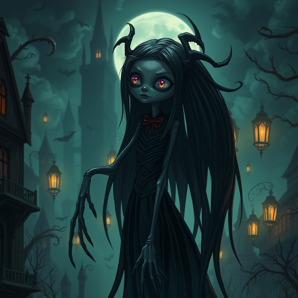 tim burton style, anime, eerie atmosphere, UHD, HDR, 16K, intricate details, hauntingly beautiful character, dark whimsical setting, gothic architecture, mysterious shadows, expressive eyes, elongated limbs, distorted proportions, surreal landscape, vibrant yet muted colors, dreamlike environment, captivating aura, fantasy elements, delicate yet unsettling, ethereal lighting, intricate textures, subtle unease, mesmerizing scene