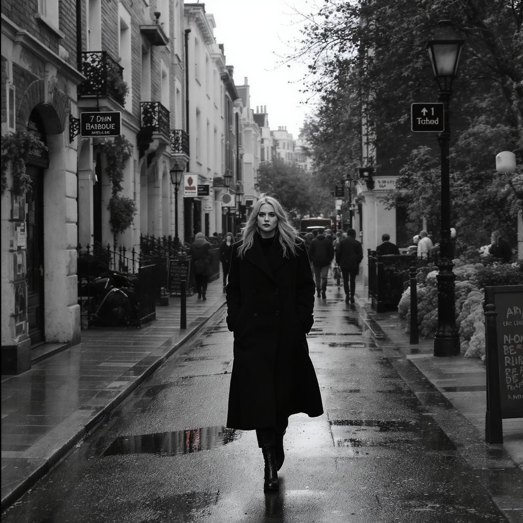 Timeless monochrome street capture of a captivating woman navigating the bustling avenues of London, taken with Arri 35 BL Camera paired with Canon K35 Prime Lenses --chaos 72 --ar 1:2 --personalize yruxpc2 --stylize 740 --v 6.1.