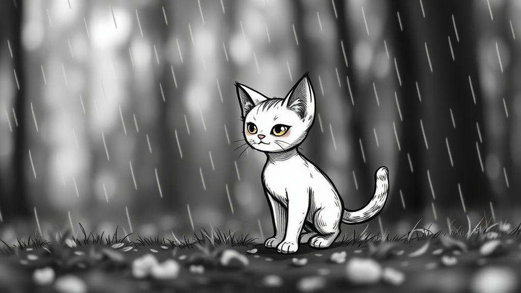 Tiny adorable cat amidst the forest, rain falling softly, character portrait style, tilt-shift effect with blurred bokeh background, monochrome palette, sketch-like appearance, unusual anatomy with peculiar proportions, an extra paw, and a missing tail.