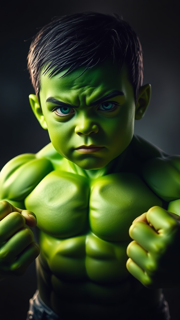Tiny green titan, lifelike and cinematic, radiating power with vibrant emerald skin under dramatic lighting, casting dynamic shadows with his intense gaze and clenched fists, capturing both the innocence of youth and the raw strength of a burgeoning powerhouse.