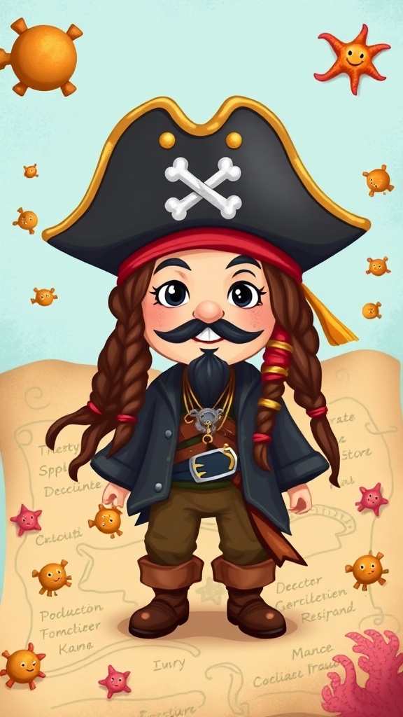 Tiny pirate adventurer inspired by Jack Sparrow, in a playful and whimsical style, with oversized hat and charming mischievous smile, surrounded by a treasure map and tiny sea creatures, vibrant colors and fun details.