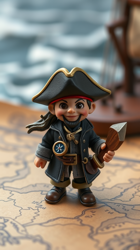 Tiny pirate adventurer with a mischievous grin, wearing a miniature tricorn hat and flowing coat, carries a tiny compass and wooden sword, standing on a treasure map with waves and mysteries around.