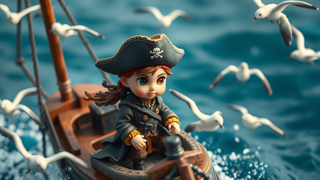 Tiny pirate adventurer with mischievous eyes, wearing a tricorn hat, flowing pirate coat, and beaded hair, sailing on a miniature ship surrounded by playful seagulls and crystal blue waves.