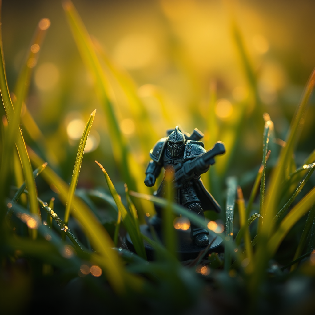 Tiny warrior figure from Warhammer 40,000 captured with a 200 mm macro lens, nestled amidst blades of grass glistening with morning dew, bathed in gentle, warm-hued light, creating a serene yet epic atmosphere --aspect ratio 3:4.