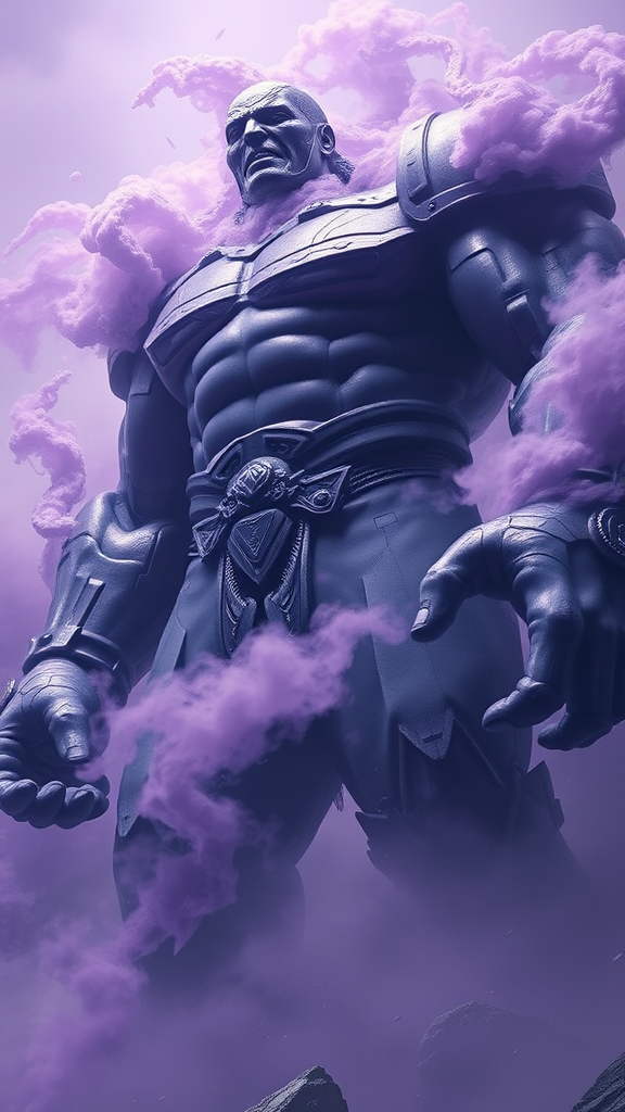 Titanic figure, enveloped in swirling amethyst mist, with a formidable blend of hulking muscle and cybernetic enhancements, colossal in stature, rendered in ultra high-definition.