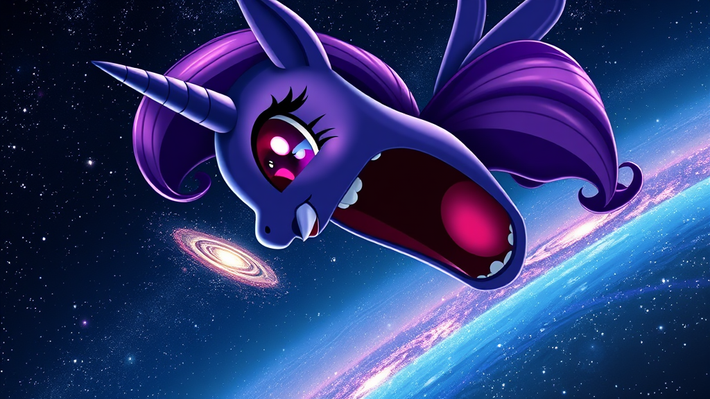 Titanic Twilight Sparkle from My Little Pony, dwarfing an entire galaxy, suspended majestically in the cosmos, an infinitesimal galaxy hovering near her massive open mouth, intense close-up from her perspective as she engulfs the galaxy, her eyes radiating with a supernatural red glow, capturing a vibrant, surreal photo-realistic essence