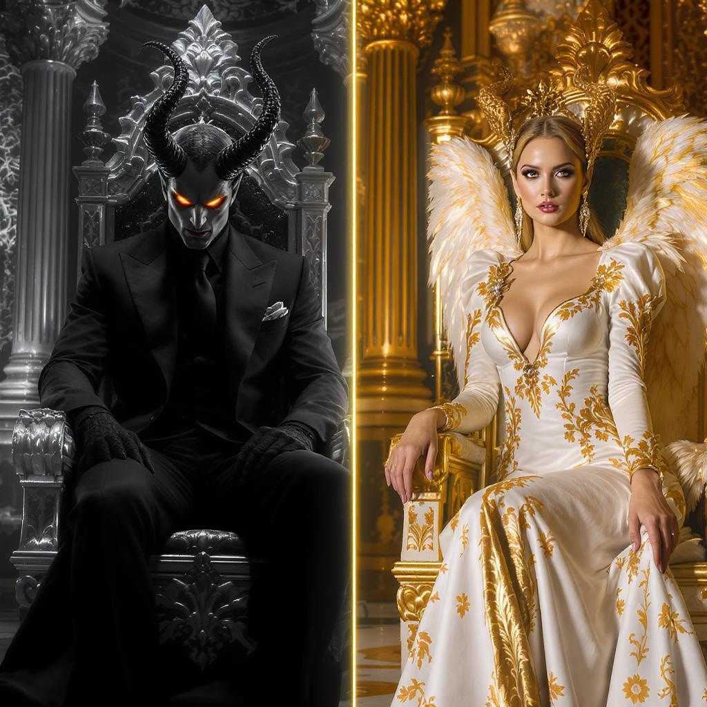 Tom Ellis as a commanding presence of Lucifer in a luminous room, seated on a magnificent gold and white throne, wearing a sleek black suit with sinister flaming eyes, captured in a meticulously composed shot employing a single-focus point technique. The scene features bright lighting, predominantly in black and white with striking gold accents, boasting high contrast and sharpness. The photography expertly utilizes depth of field to convey a sense of power and dominance, employing a high-end camera with a high ISO setting and strategically placed lighting for a breathtakingly modern image. Next to the throne stands Megan Fox, embodying an angelic figure in a sophisticated white and gold ensemble. Her regal and graceful color palette is presented with high contrast and sharpness, capturing her beauty and authority through precise depth of field technique. The overall composition reveals an elegant balance of power, achieved with a high-end camera and meticulous lighting, resulting in a visually stunning photograph.