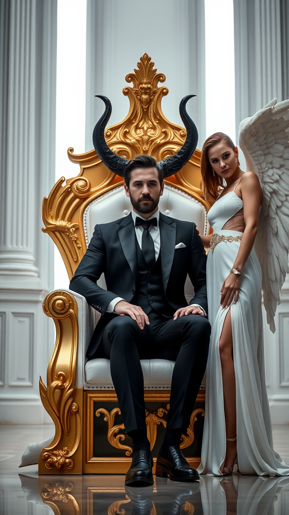 Tom Ellis as Lucifer in a bright room, seated on a majestic gold and white throne, wearing a sleek black suit with eyes blazing with flames. The composition is meticulously crafted with a single-focus point technique, featuring bright lighting and a color scheme of black, white, and gold accents. The image boasts high contrast and sharpness, with expert use of depth of field, conveying a sense of power and dominance from a high-end camera set to a high ISO setting. Skillful lighting enhances the modern photographic style. Standing next to the throne is Megan Fox as an angelic figure, dressed in an elegant white and gold costume, exuding a regal aura with a refined color palette. The photograph captures both beauty and power with high contrast and sharpness, showcasing the expert depth of field and precise lighting placement for a stunning visual impact.