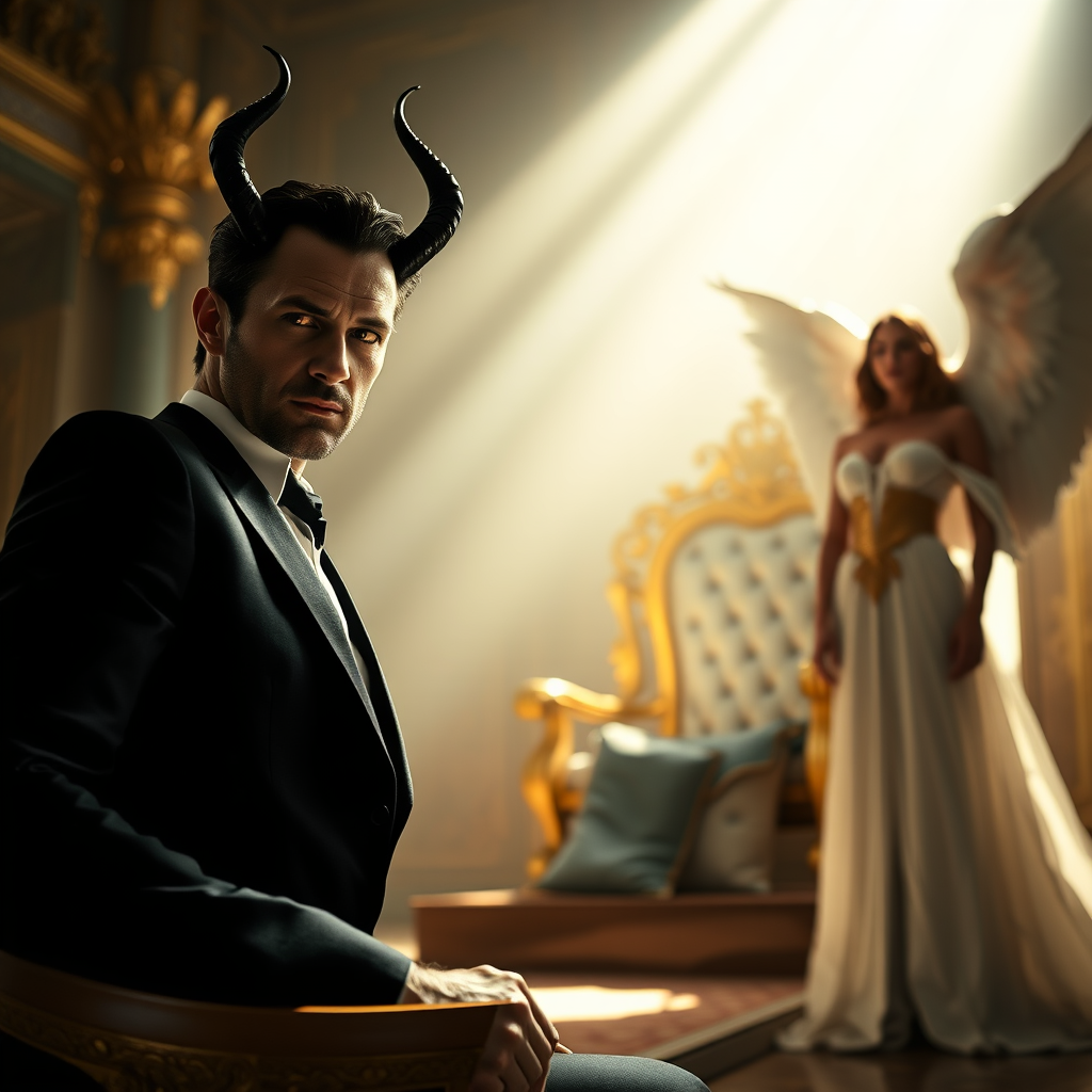 Tom Ellis as Lucifer in a luminous room, regal gold and white throne, sleek black suit, eyes ablaze with intensity, meticulously composed scene, single-focus point approach, bright illumination, monochrome with golden highlights, heightened contrast and clarity, masterful use of depth of field, perspective of power and authority, high-definition camera with elevated ISO level, strategically positioned lighting, captivating modern photography. Megan Fox as an ethereal angel, poised beside the throne, elegant white and gold attire, sophisticated color scheme, striking contrast and sharpness, skillful depth of field application, a blend of beauty and strength, captured with a high-end camera at elevated ISO, expertly arranged lighting, breathtaking image.