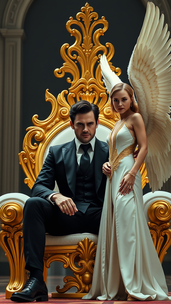 Tom Ellis as Lucifer in an illuminated room, seated on a majestic gold and white throne. He wears a sleek black suit, with intense, fiery eyes. The shot is meticulously composed using a single-focus technique, featuring bright lighting and a black and white palette accented with gold. The image boasts high contrast and sharpness, with expert depth of field usage, and conveys a perspective of power and dominance. Captured with a high-end camera set to a high ISO, the lighting is strategically positioned to enhance the scene's modern photographic quality. Beside him stands Megan Fox, embodying an angelic figure, adorned in a luxurious white and gold ensemble. The color scheme is regal and sophisticated, emphasizing contrast and sharpness. Her presence is captured with a focus on beauty and strength, using professional photography techniques and lighting to create a breathtaking image.