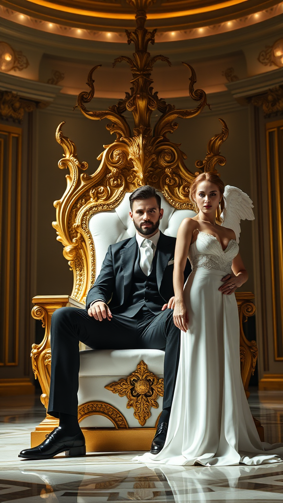 Tom Ellis as Lucifer seated in a radiant room on an impressive gold and white throne, dressed in a sleek black suit, his eyes ablaze with a fiery intensity. The scene is meticulously composed with a focused single-point technique, utilizing bright lighting. The image is in monochrome with striking gold highlights, showcasing high contrast and sharpness with an expert application of depth of field, emphasizing a perspective of power and dominance. Shot with a high-end camera using a high ISO setting and strategically positioned lighting, it results in stunning modern photography. Alongside, Megan Fox embodies an angelic figure, standing next to the throne in an elegant white and gold ensemble. The color palette is regal and sophisticated, with the same high contrast, sharpness, and depth, projecting beauty and authority. The photograph captures both figures in a harmonious yet powerful composition, defined by brilliance and excellence in photographic execution.