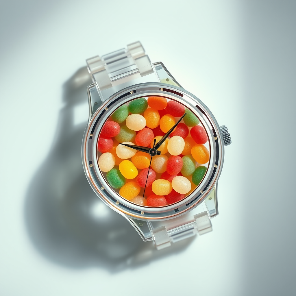 Top-down cinematic fine art photograph in a professional studio setting, featuring a transparent vinyl watch crafted from translucent glass. The watch is filled with vibrant, colorful jelly beans, boasting a high refractive index. Frosted glass surfaces complement pastel hues with subtle pale yellow accents, capturing a serene and minimalistic essence in the style reminiscent of Dieter Rams illustrator.