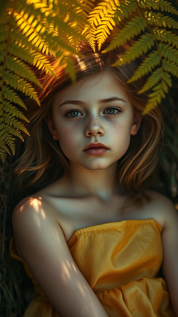 Top tier, 4k clarity, ultra-high resolution, masterwork, incredibly detailed, lifelike depiction, portrait of a freckled girl in a golden dress, reclining beneath a fern canopy in the woods, warm amber lighting from above, striking form, vibrant sunlit hues, subtle depth of field, gentle atmospheric ambiance, compelling portraiture, flawless anatomy, premium quality, high resolution, realistic imagery, expert photography, cinematic perspective, invigorating, light streaming, movie-like illumination, gentle mist enveloping.