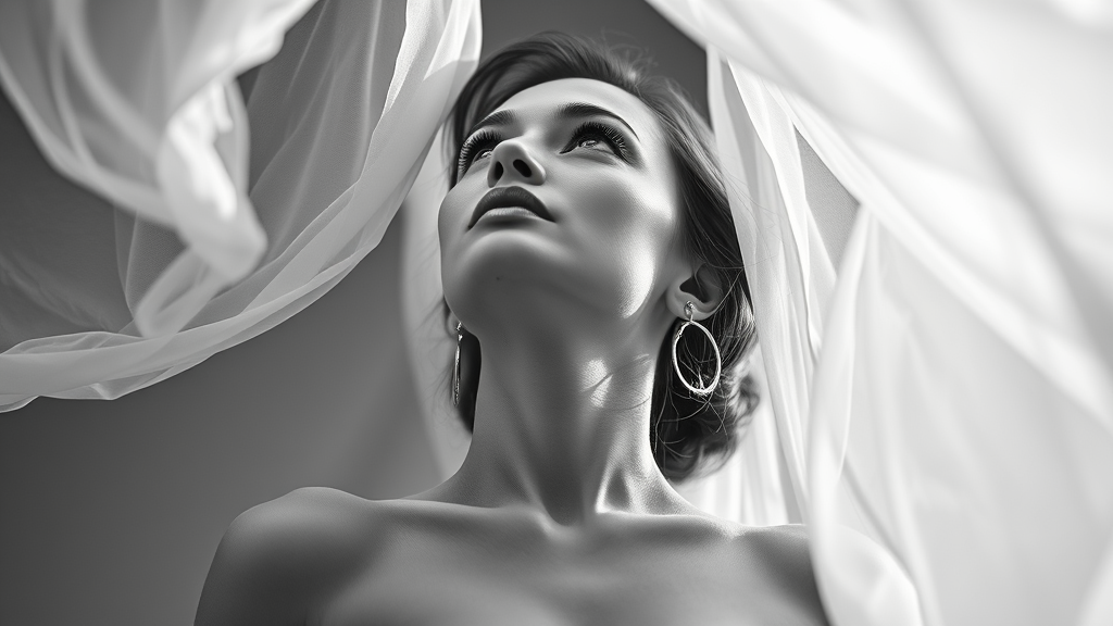 Top-tier quality, 4k resolution, high-definition, stunning masterpiece, ultra-detailed and realistic portrayal, fashion spread, monochrome photography, a beautiful woman gazing upward, elegant white gown, delicate white fabric suspended in air, shallow focus, gentle and atmospheric setting, compelling portraiture, flawless anatomy, premium quality, high-resolution, life-like image, expert-level photography, cinematic perspective, dynamic composition, radiant light shining through.