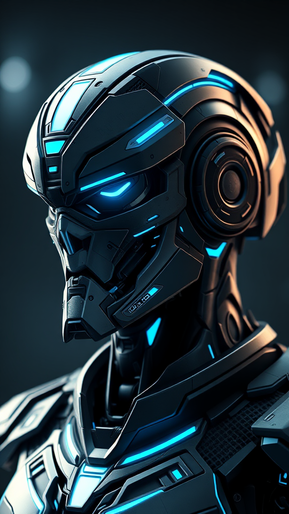 Top-tier quality, artistic marvel, cg, desktop background, dynamic range, high-definition, incredibly detailed, photorealistic, advanced military cyborg, cyberpunk influence, warframe, covert, armored, neon glow, pattern blending, monochrome with blue accents, grand, character concept, hard surface design, polished, expressive face, complex features, symmetrical structure, volumetric lighting, ambient illumination, real-time effects, vfx, profile view, mouth, ears, cutouts, asymmetrical elements, partially visible, flawed art, out-of-focus, incorrect proportions, distorted anatomy, unattractive, elongated neck, cropped head, repetition, mark, text, labels, watermark.