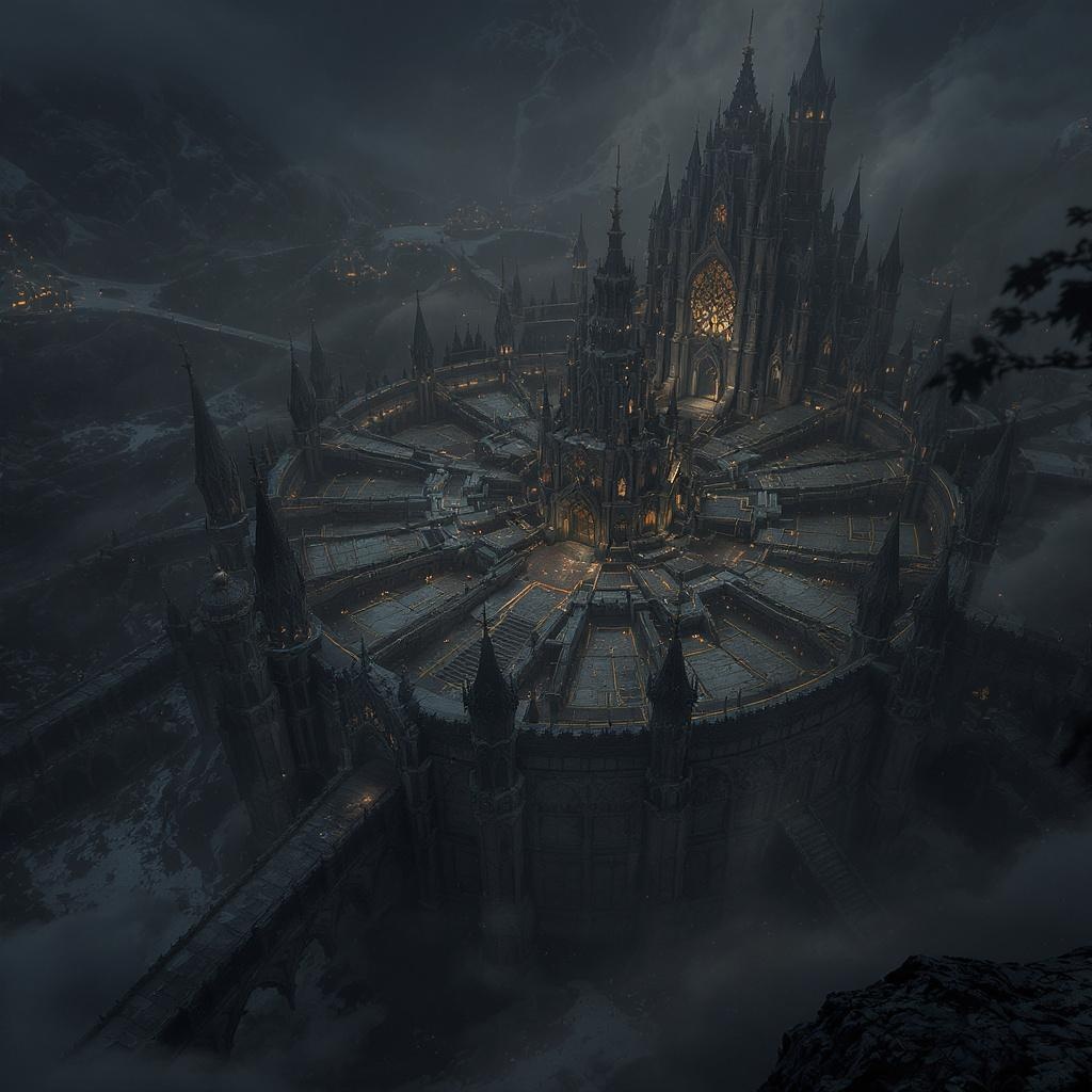 View this AI-generated image featuring top view of an intricately designed supermassive royal fortress set in a dark fantasy realm featuring cgi elements the scene incorporates depth focus and ethereal volumetric lighting achieving a photorealistic appearance the fortress is exquisitely detailed hyp