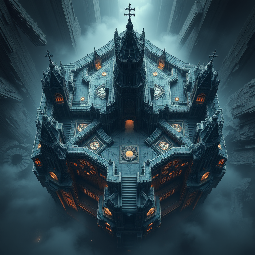 Top view of an intricately designed colossal imperial fortress, set in an ominous fantasy world, featuring complex architectural details, dynamic depth focus, enveloped in ethereal volumetric lighting, strikingly photorealistic, highly detailed, with a hyperrealistic rendering that exudes complexity and maximalism amidst a surreal atmosphere.