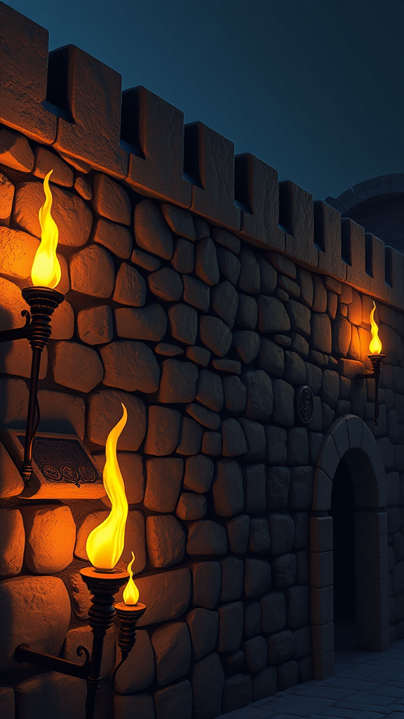 Torches illuminating a medieval wall with realistic shadows, a 3D HDR cartoon style with an Asian influence, featuring vibrant, unusual colors and a slightly soft focus, the scene includes tastefully artistic representations of the human form in its natural state.