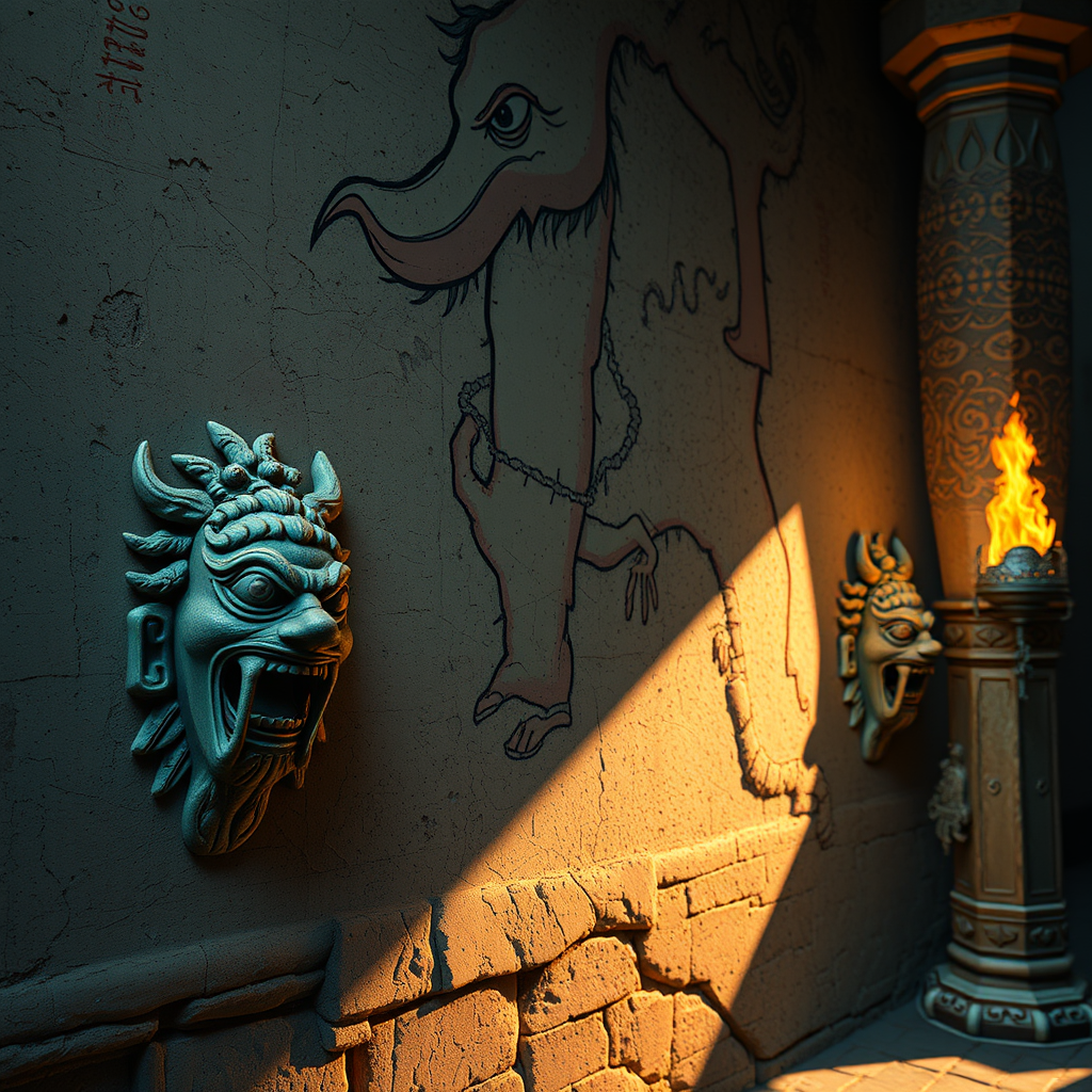 torches on an ancient temple wall, weathered, real shadow, 3d, vibrant cartoon, 3d, mystical, jade statue, M-owned masks, fantastic creatures, sacred fresco, bizarre colors, soft focus, subtly implicit nudity, suggestive, semi-revealed, slightly veiled