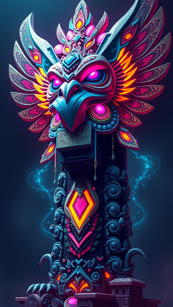 Totem animal inspired by Aztec and tribal elements, featuring intricate greeble patterns in a vibrant, ornate fantasy style. The artwork evokes the aesthetics of Hearthstone and Ankama, with a cinematic flair reminiscent of a GTA5 cover. It embodies the official Behance and ArtStation quality, reflecting the influences of artists like Jesper Ejsing, RHADS, Makoto Shinkai, Lois van Baarle, Ilya Kuvshinov, and Rossdraws. The totem radiates with pastel colors and a glowing aura, emphasizing sharp focus and elegance. This digital painting is a concept art masterpiece, merging matte and vibrant finishes, inspired by the works of WLOP, Artgerm, Greg Rutkowski, and Alphonse Mucha.