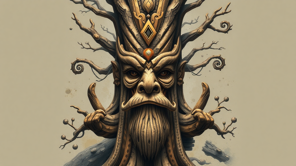 totempunkai concept art, a totem portrait of a majestic ivory pine tree, surrounded by abstract forms, rustic elements, and subdued colors, artistically interpreted with emphasis on intricate carvings and natural motifs, subtle imperfections, thoughtfully crafted, evokes a sense of ancient wisdom and nature's resilience, blending technology and organic beauty in a visionary style.