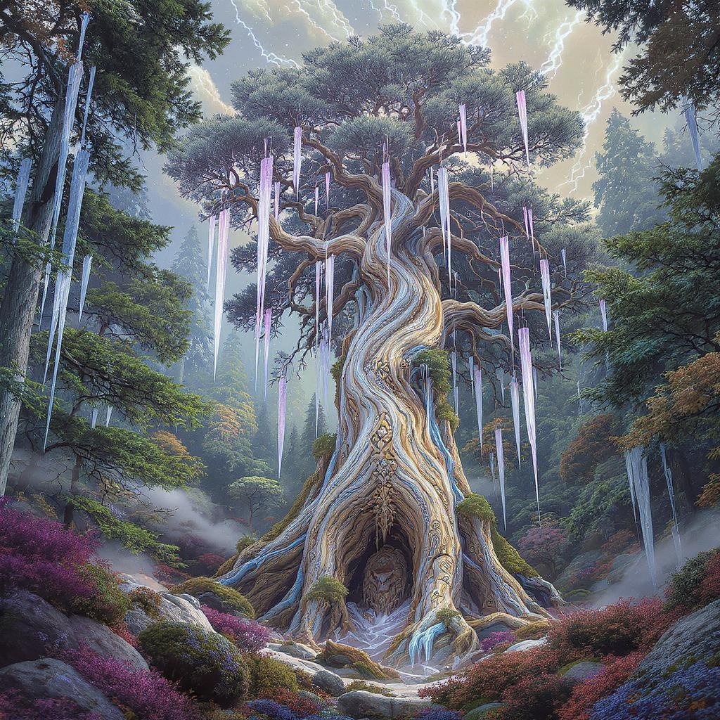 Totempunkai concept art featuring a totem portrait of an ivory pine tree surrounded by an ethereal forest with delicate and intricate carvings, capturing a mystical essence with an emphasis on natural shapes and textures, evoking a sense of wonder and awe, vibrant colors and subtle shades blend harmoniously to create a dynamic yet serene atmosphere, intricate details highlight the tree’s wisdom and strength while the forest provides a lush, enchanted backdrop.