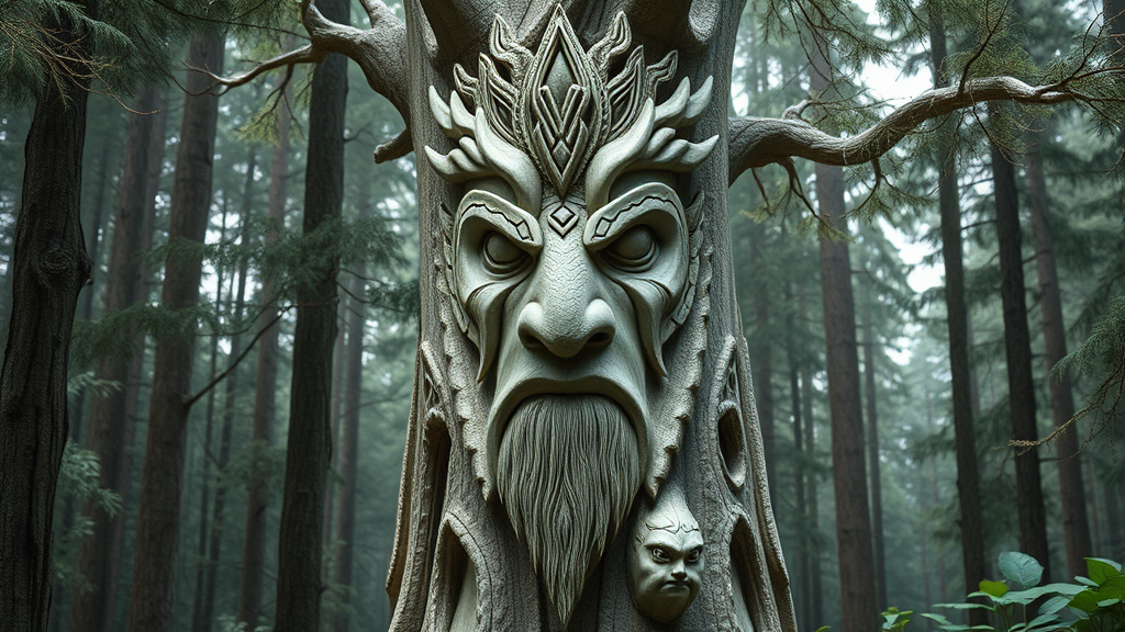 totempunkai concept art, totem portrait of ivory pine tree, natural elements, mystical and intricate design, ethereal atmosphere, detailed carving, harmonious blend of nature and magic, subtle textures, vibrant colors, aura of ancient wisdom, surreal and imaginative forest setting, elements of wonder and serenity