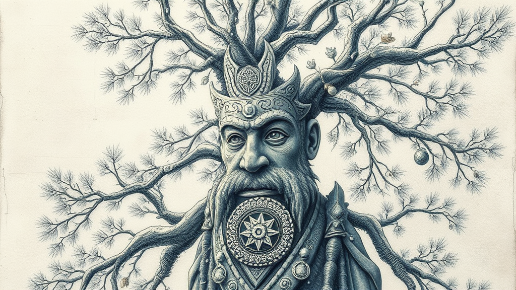 Totempunkai-inspired concept art, a totem portrait of a pure white pine tree, interwoven with intricate patterns and symbols, adorned with natural elements like leaves and branches, emits an ethereal aura, creatively transformed with a rugged, raw texture, detailed and captivating, reflecting both beauty and the imperfections of nature.