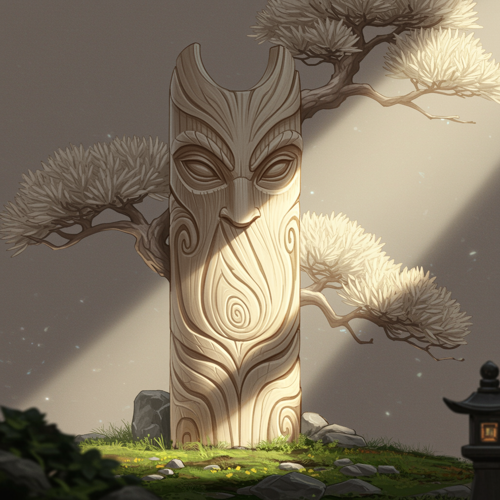 Totempunkai-inspired concept art, depicting a totem portrait of an intricate ivory pine tree. The design maintains a refined, high-quality aesthetic, showcasing the delicate interplay of light and shadow on the tree's surface, with detailed carvings and textured bark. The scene evokes a sense of wonder and nature's elegance, set against a backdrop that complements the totem's ethereal beauty.