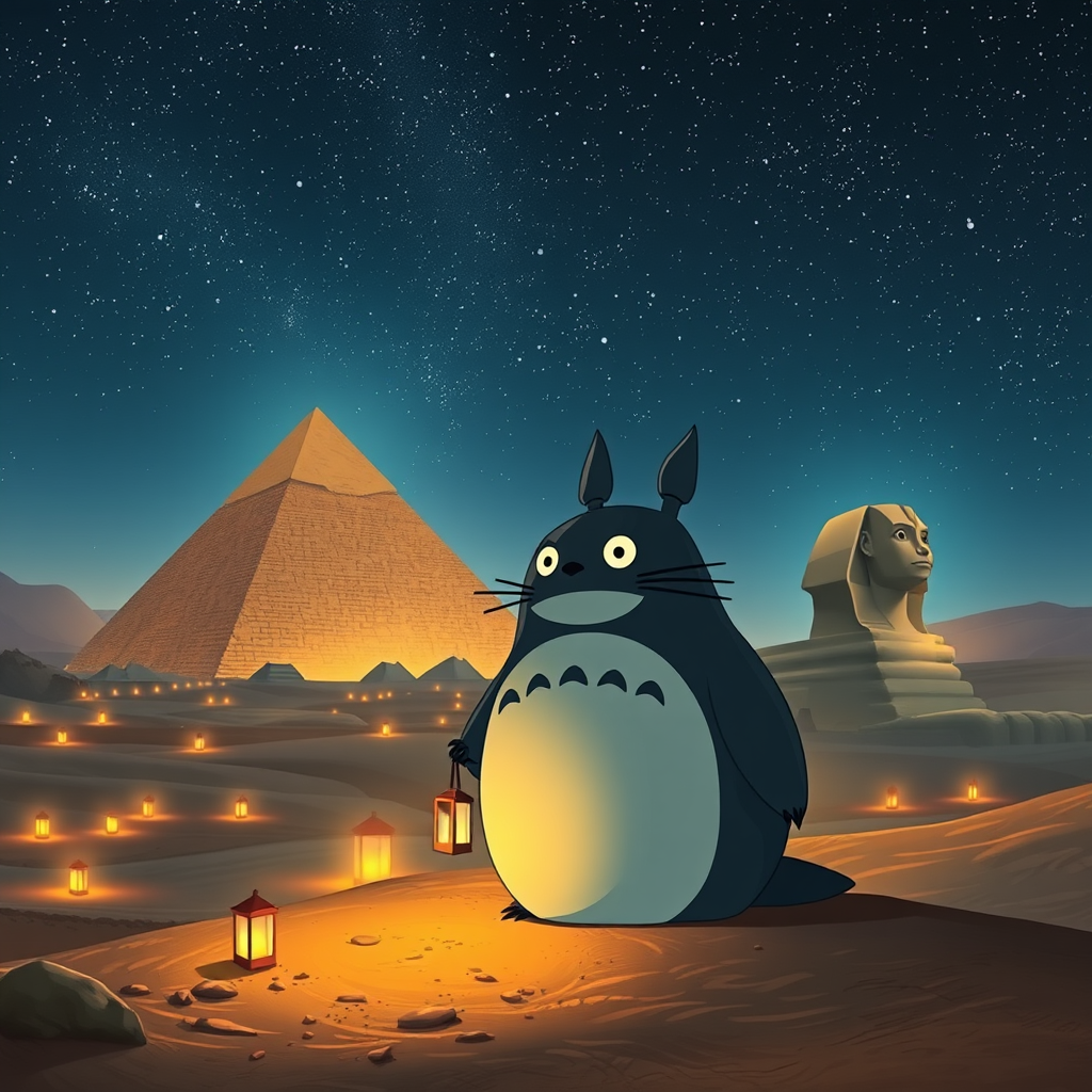 Totoro exploring the ancient pyramids of Giza under a starlit sky, surrounded by the soft glow of lanterns, blending seamlessly with the timeless majesty of the desert landscape and the enigmatic Sphinx. The scene captures a whimsical fusion of fantasy and history, with the iconic, gentle forest spirit bringing a sense of playful wonder to a land steeped in mystery.
