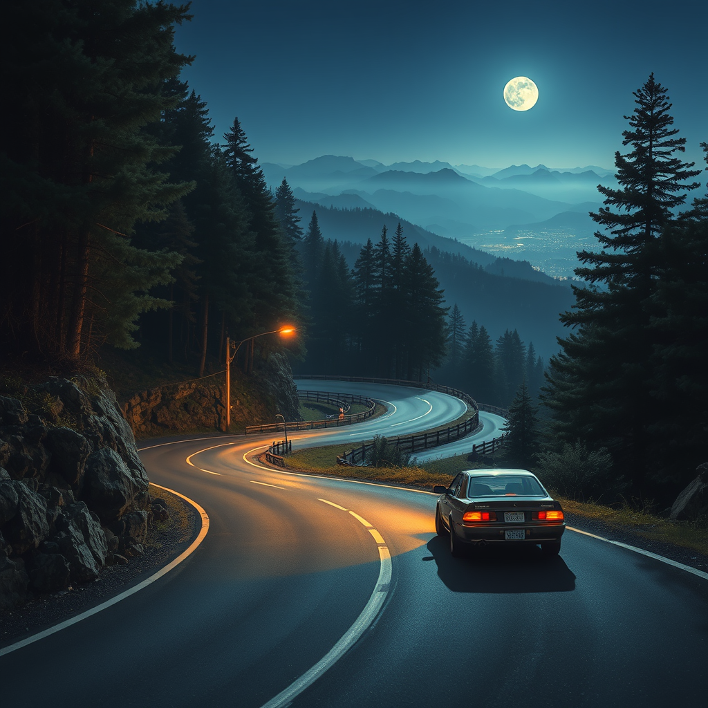 Touge Takashi, a master of winding mountain paths, navigates the serpentine roads with unparalleled precision in the cool night air. The gentle hum of the engine and the flicker of distant city lights accompany his journey, as shadows of towering pine trees dance around him. He's driven by a blend of focus and instinct, each turn revealing breathtaking vistas of moonlit valleys and misty peaks that inspire a serene, almost poetic connection with the road.