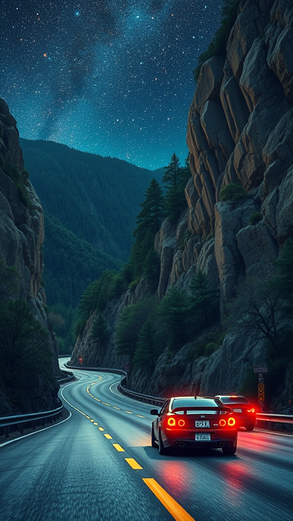 Touge Takashi: a thrilling ride through winding mountain roads, where the roar of the engine echoes against towering cliffs and the scent of pine fills the air, capturing the essence of adrenaline-fueled night races under a starry sky.