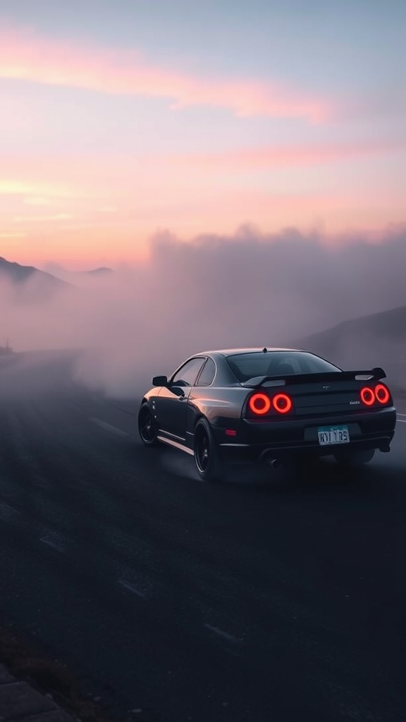 Touge Takashi drifts with precision through mist-covered mountain roads, his car's sleek silhouette slicing through the early morning fog, tires gripping the asphalt with expert finesse, while the dawn sky begins to blush with hues of pink and orange, the serene landscape a sharp contrast to the adrenaline-fueled dance of speed and control.