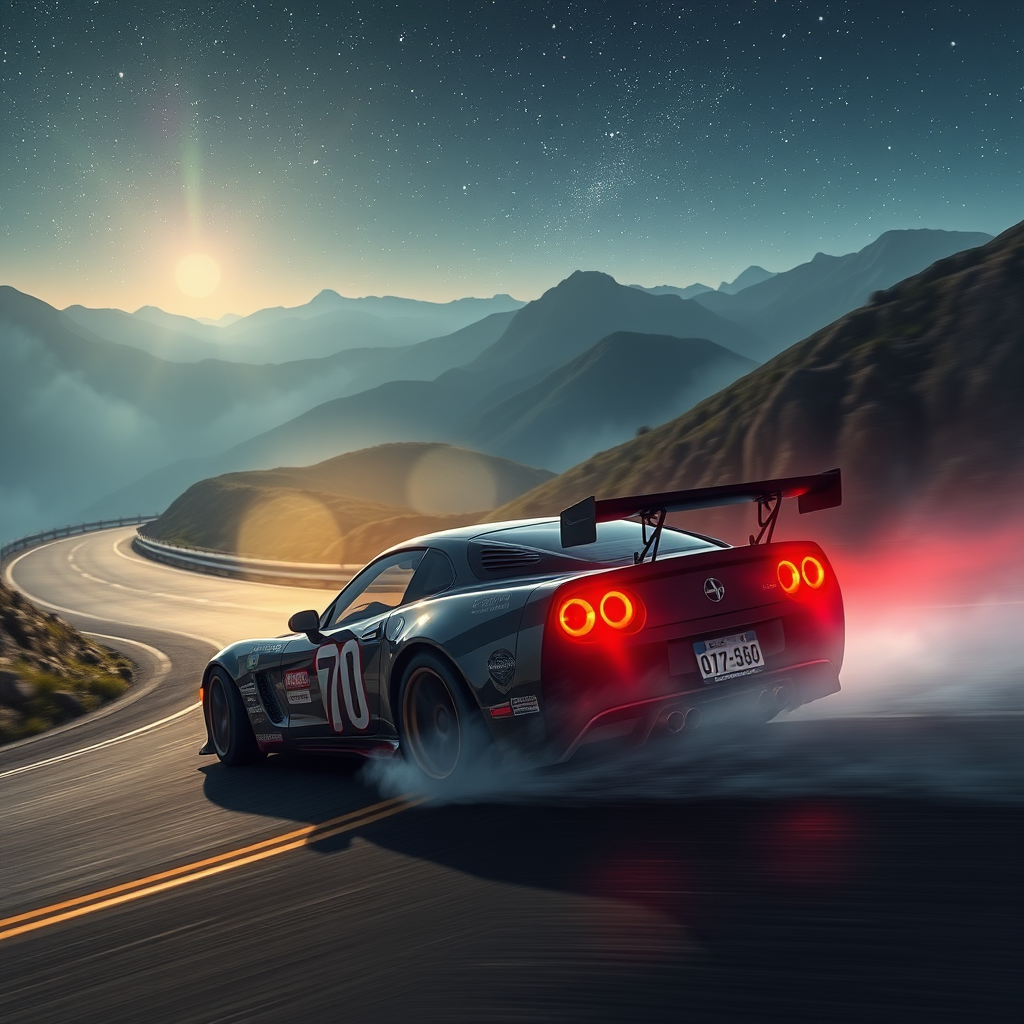 Touge Takashi racing through the winding mountain roads under a starry night sky, headlights cutting through the mist, tires gripping tightly as they navigate hairpin turns with precision and grace, the roar of the engine echoing through the serene landscape, taillights leaving a trail of red streaks along the asphalt, a symphony of speed and skill, adrenaline-fueled focus driving toward mastery of the mountain pass.
