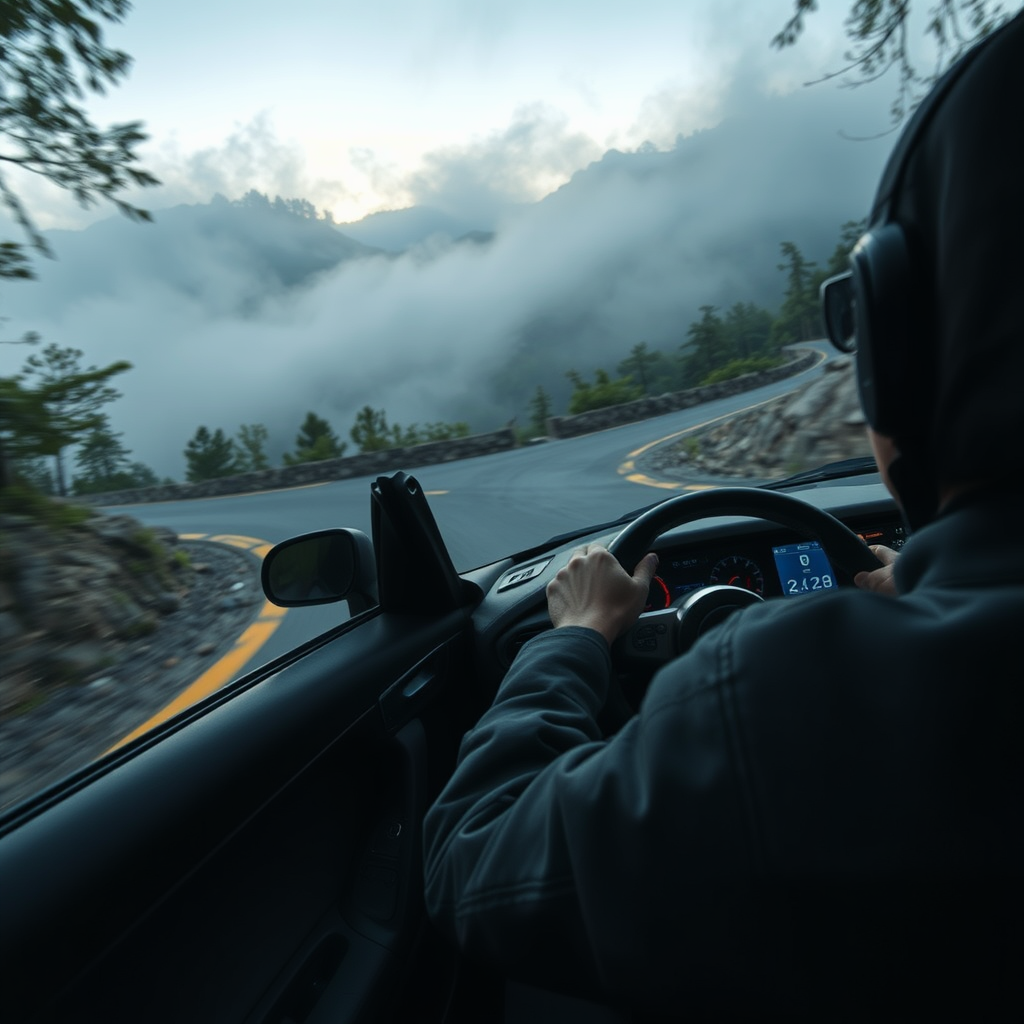 Touge Takashi speeding through mist-laden mountain curves, aggressive focus in his eyes, gripping the steering wheel with precision and intensity, dusk light casting shadows on the winding road, leaves rustling in the breeze as the roar of the engine echoes through the serene landscape, adrenaline-fueled thrill of racing against time and nature.