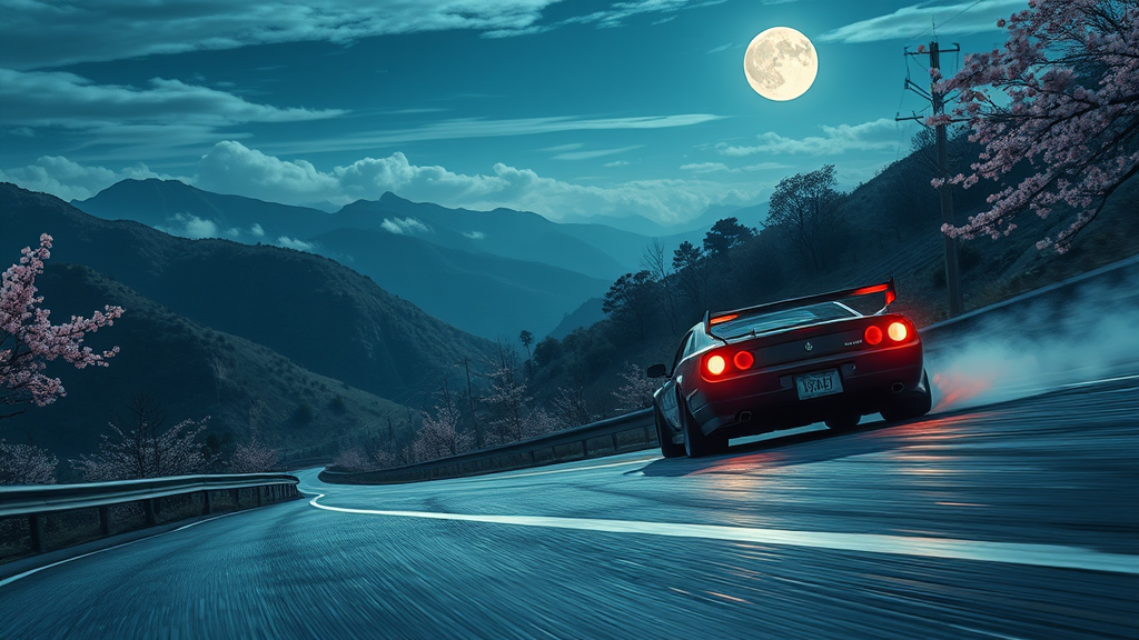 Touge Takashi speeds through the winding mountain roads under the moonlit sky, the roar of the engine echoing through the valleys as cherry blossoms scatter in the night breeze, the car's headlights cutting through the mist like a sword, precision and adrenaline in perfect harmony, the spirit of the road guiding him, each turn a dance with destiny.