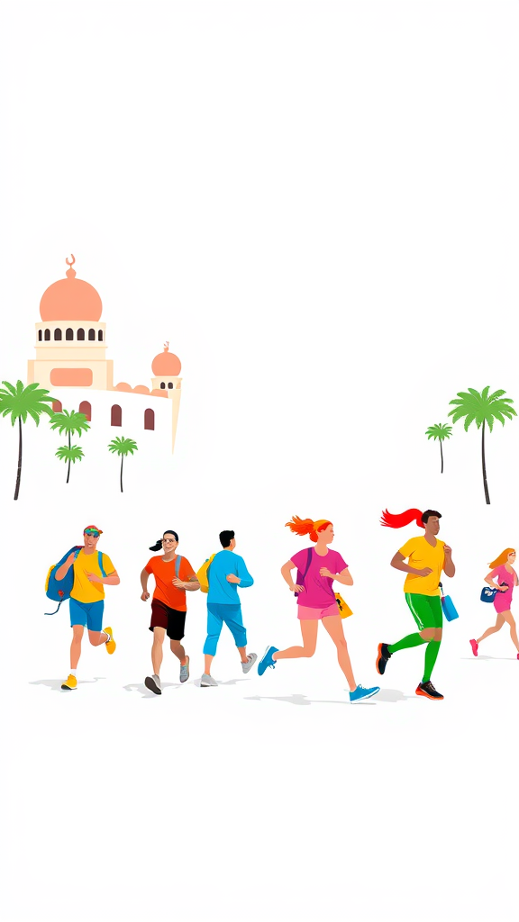 Tourism artwork depicting people jogging in vibrant, multicolored attire on a crisp white backdrop, featuring a playful exploration of travel themes with clean lines, bold shapes, and a fresh, minimalist aesthetic, inspired by the spirit of adventure and discovery.