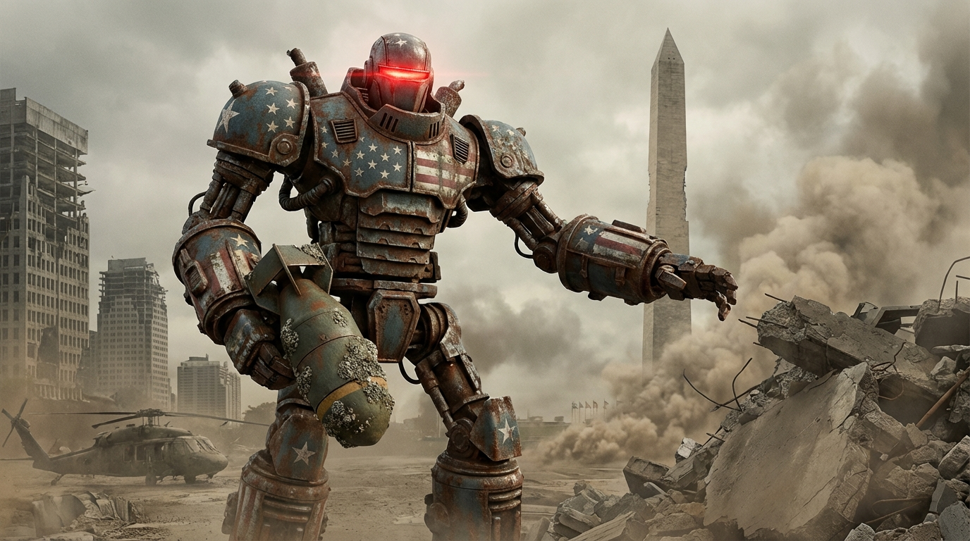 A colossal, weathered robot adorned with American flag motifs stands heroically amidst a ruined, post-apocalyptic cityscape. It clutches a rusty atomic bomb, its red eyes glowing menacingly under a dusty, overcast sky, evoking a sense of gritty realism.