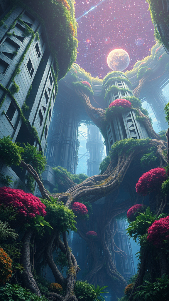 Towering walls intertwined with the roots of colossal trees, a vibrant tapestry of lush vegetation spreads throughout an immense sci-fi space station. The scene is a spectacle of botanical gigantism beneath a canopy of stars, set against the infinite backdrop of space. The atmosphere resonates with a dystopian essence, evoking a mesmerizing game art aesthetic reminiscent of Tsutomu Nihei's style, reminiscent of works like Blame! and Sidonia no Kishi. The visuals bear anime and manga influences, filled with intricate details and hyperrealism. The highest quality and resolution capture a stunning play of flashing and ambient lighting, creating an 8K Ultra-HD experience. Optical fibers weave through the environment, enhancing the sci-fi allure. The perspective offers a third-person view, ensuring the vastness and detail of this botanical space station are fully appreciated.