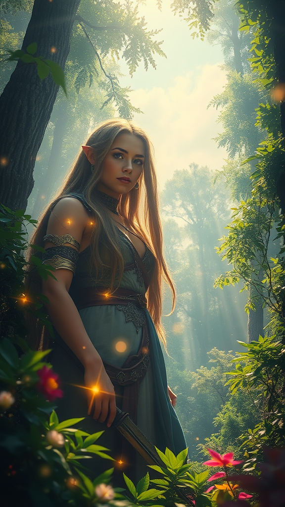 Towering warrior woman amidst a vibrant, enchanted forest, her features captured in ultra-realistic detail. Soft fairy lights dance around, casting a magical glow on her surroundings. Bright, ethereal colors paint the sky, while volumetric rays of light filter through lush greenery, creating an HDR-like visual masterpiece.