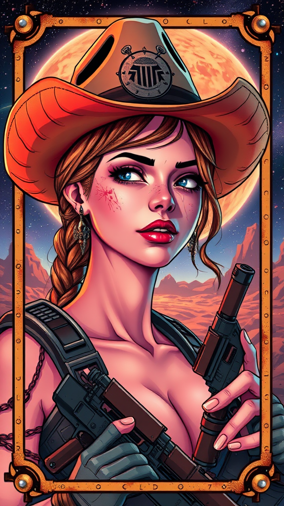 Trading card frame, female space cowboy, adorned with a cowboy hat, featuring highly detailed skin with stunning gradient colors, set against an intricate alien planet backdrop within a galaxy, in a style inspired by Borderlands, showcasing exceptional detail with absurd resolution and HDR quality. Utilizing cel shading and volumetric atmospheric effects, with earrings and a slightly dirty face adding character. Excludes cropped, low resolution, text, jpeg artifacts, signatures, watermarks, usernames, blurriness, artist names, trademarks, and titles, while avoiding multiple views and reference sheet formats. Includes long neck, equipped with guns and pistols, ensuring a dynamic, vibrant visual narrative.