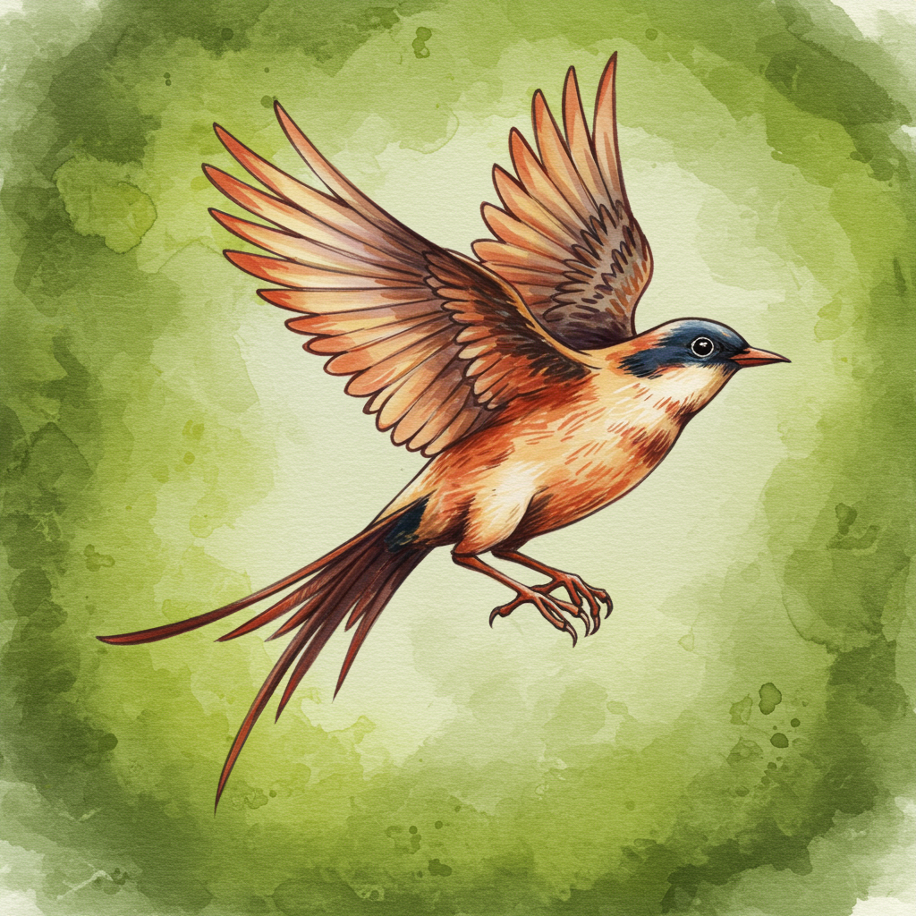 Traditional illustration of a bird in flight, capturing the essence of harmony with a Romanticism watercolor style. The artwork features an earthy color palette against a lush green backdrop, infused with subtle creative elements that enhance its raw authenticity.